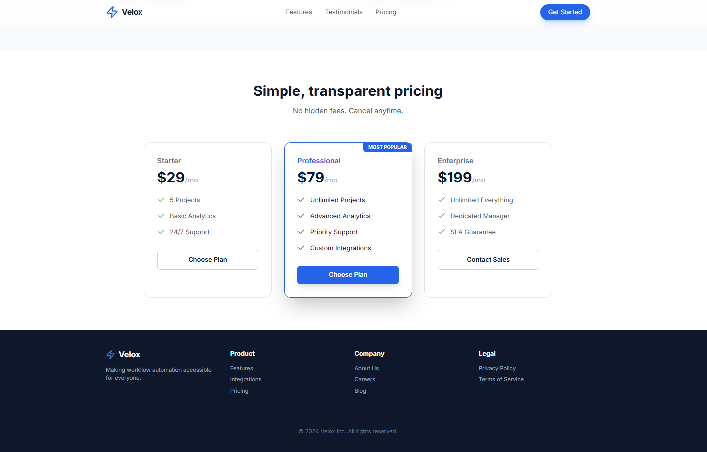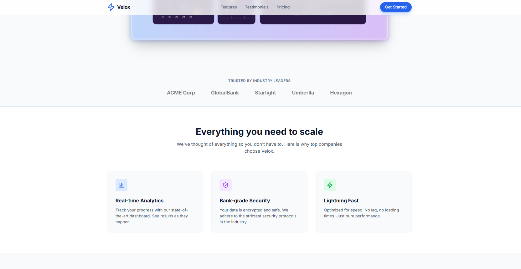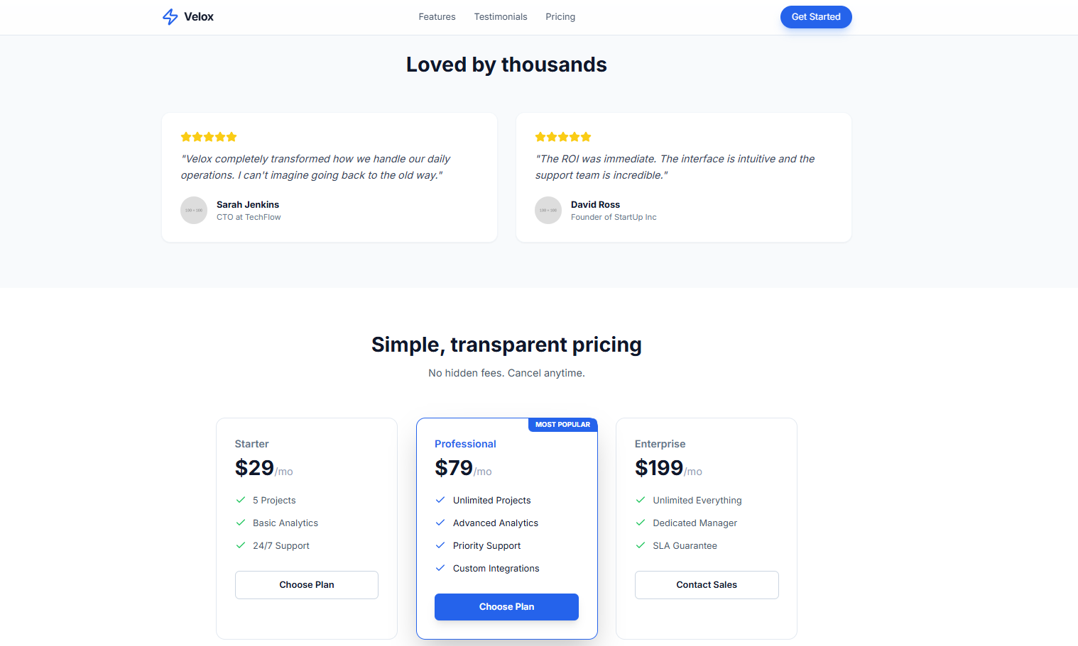 • Implementation: The layout creates a mobile-first experience that stacks vertically (grid-cols-1) and expands to a three-column layout (md:grid-cols-3) on tablet and desktop screens. This is applied consistently across the Features, Testimonials, and Pricing sections for visual rhythm.